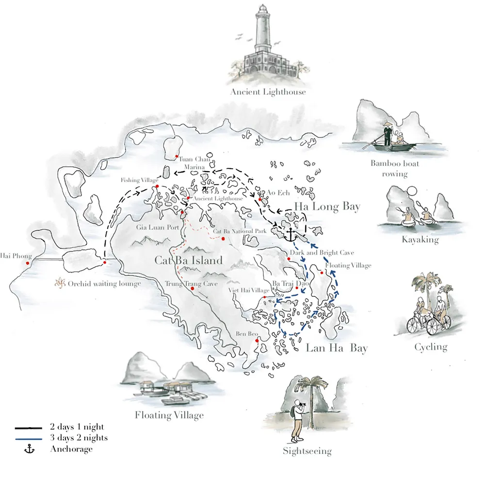 Viaggio di 3 giorni e 2 notti in crociera Orchid Premium con la massima privacy per il vostro viaggio in crociera nella baia di Halong. Tutte le cabine sono ben progettate con ampie finestre a tutta vista aperte sul mare per permettervi di godervi la baia di Halong - Lan Ha Bay dal vostro balcone privato, garantendovi un ricordo indimenticabile del nostro leggendario paesaggio.